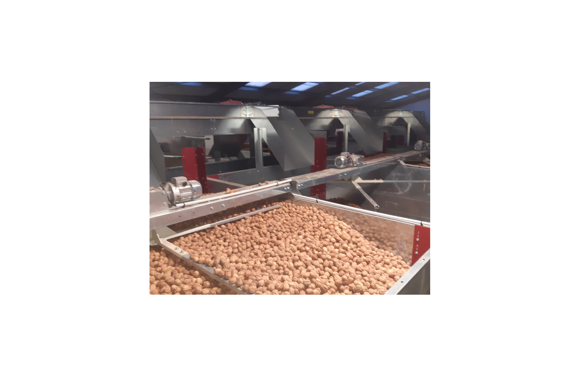| Working | The dryer with floors is composed of a set of superimposed hatches with centralized opening. It allows to work continuously by passing nuts from the upper floor to the lower floor. |