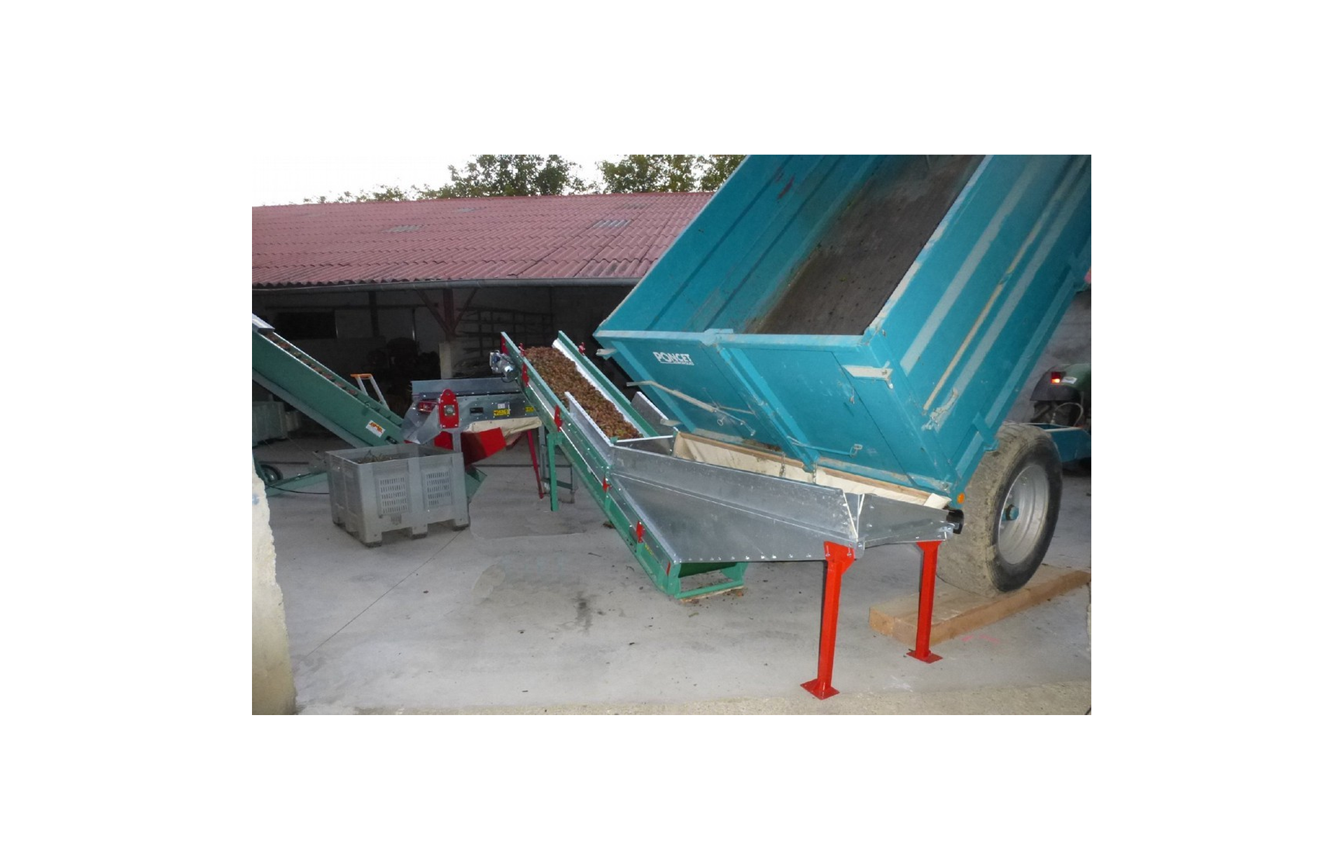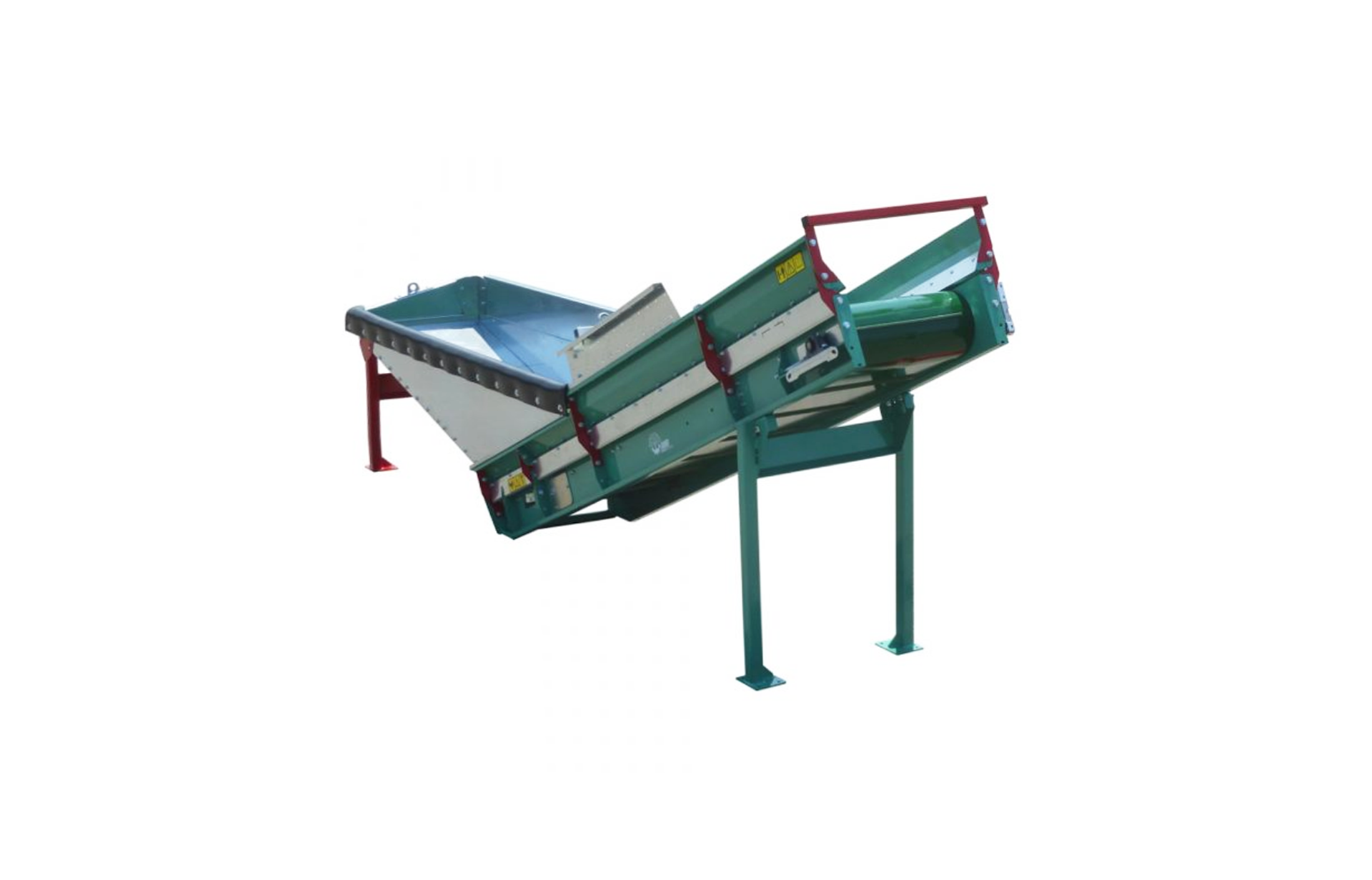 რეზერვირების ბუნკერი TK3 მისაბმელის დასაცლელად. მტკიცე შეღებილი შედუღებული ჩარჩო, რეგულირებადი სიჩქარის სამფაზიანი ამძრავი და 3 მ დახრილი PVC ლენტი. შესაძლებელია 1 მ-იანი დაგრძელება საცრის მისაწოდებლად.